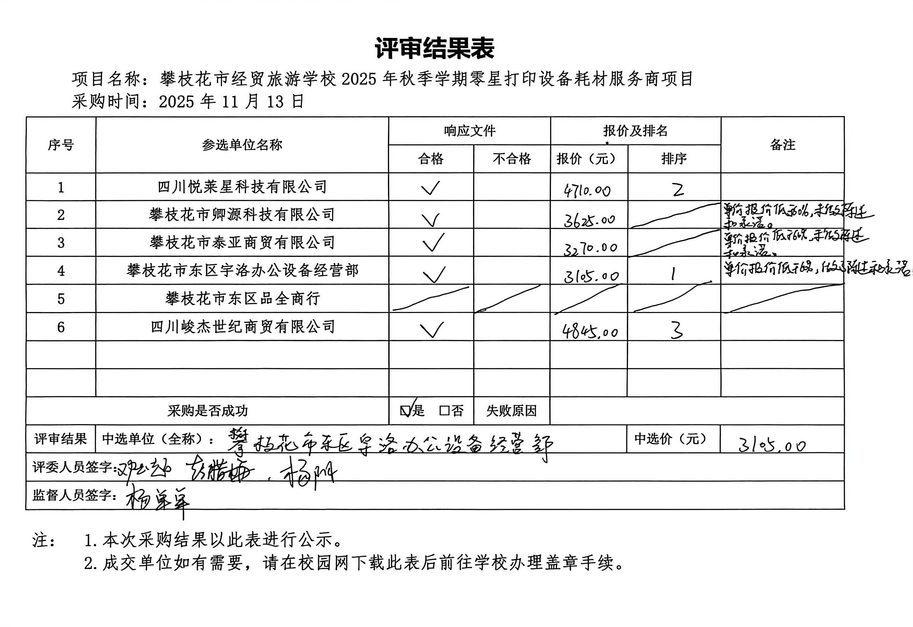 攀枝花市经贸旅游学校2025年秋季学期零星打印设备耗材服务商项目结果公告
