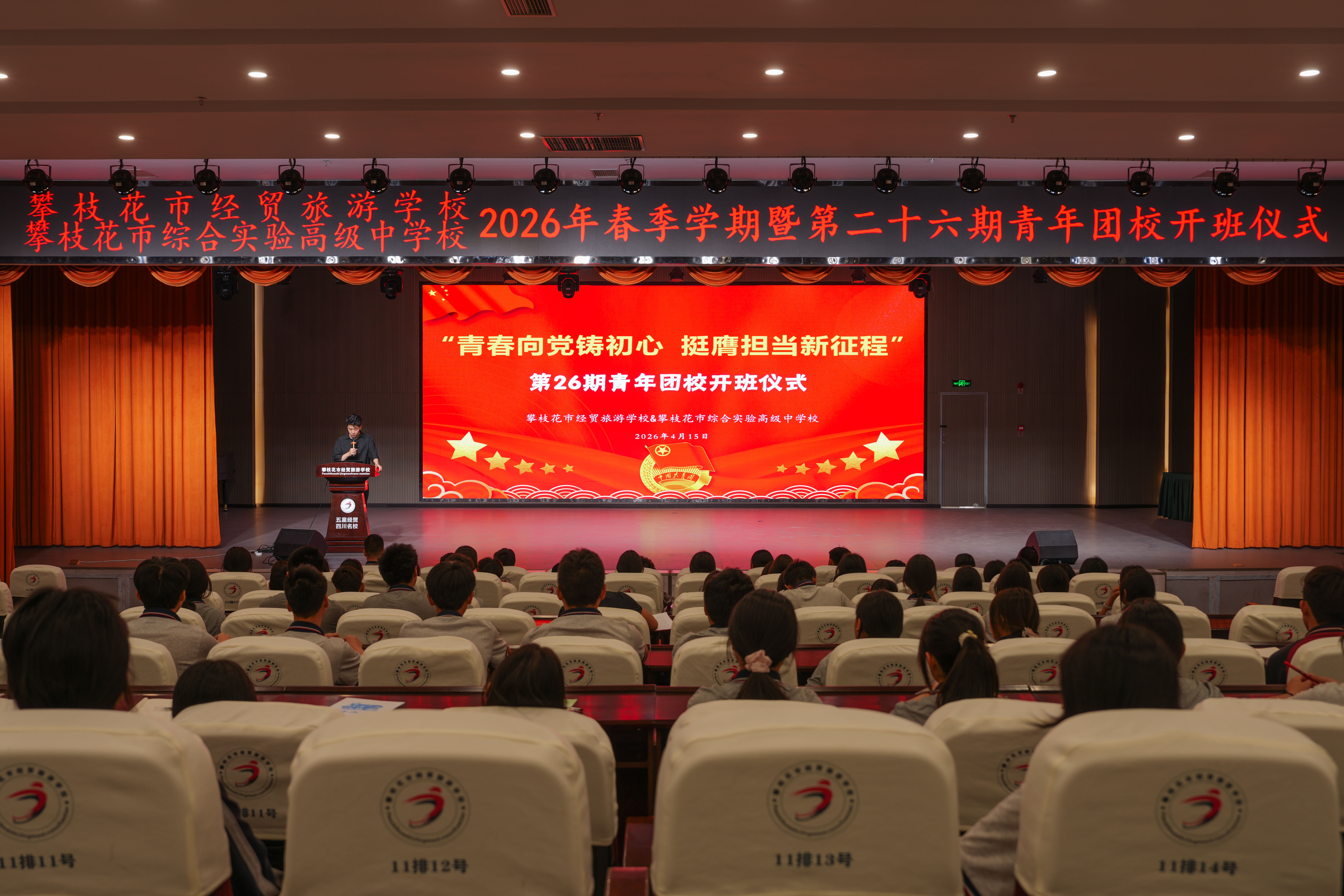 2026年4月15日上午,攀枝花市经贸旅游学校第二十六期青年团校开班仪式在江南校区VR体验馆、江北校区阶梯教室同步举行。本次开班仪式以“青春向党铸初心 挺膺担当新征程”为主题,由张涛、任靖宇老师分别主持,学校领导肖超、廖裕及200余名团干部、入团积极分子参加此次开班仪式。