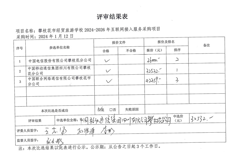 攀枝花市经贸旅游学校2024—2026年互联网接入服务项目采购比选结果公告