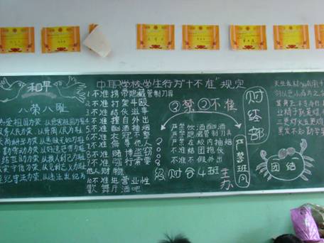 财经专业部切实贯彻了此次四川省教育厅的“三禁两不”精神,利用班级板报积极宣传“三禁两不”及中职学校学生行为“十不准”,在班会课教育学生认真学习并切实贯彻此次精神,要求学生在学习“三禁两不准”后谈自身体会并写成心得。